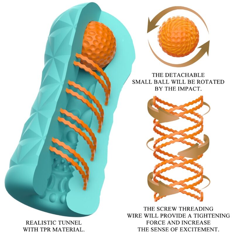 ¡Pequeña herramienta para una gigantesca diversión de masturbación! Este masturbador transparente y reutilizable tiene una espiral giratoria y una bola de estimulación en el costado, la espiral giratoria hace que el masturbador gire durante la penetración y la bola en la parte superior puede estimular el punto correcto y brindarle una nueva sensación. La funda presenta una textura estimulante y excitante en su interior que masajea el pene de forma intensa y dinámica durante un trabajo manual. Puede utilizar este elegante masturbador agradable para la piel una y otra vez. ¡Muy fácil de usar y puro placer!